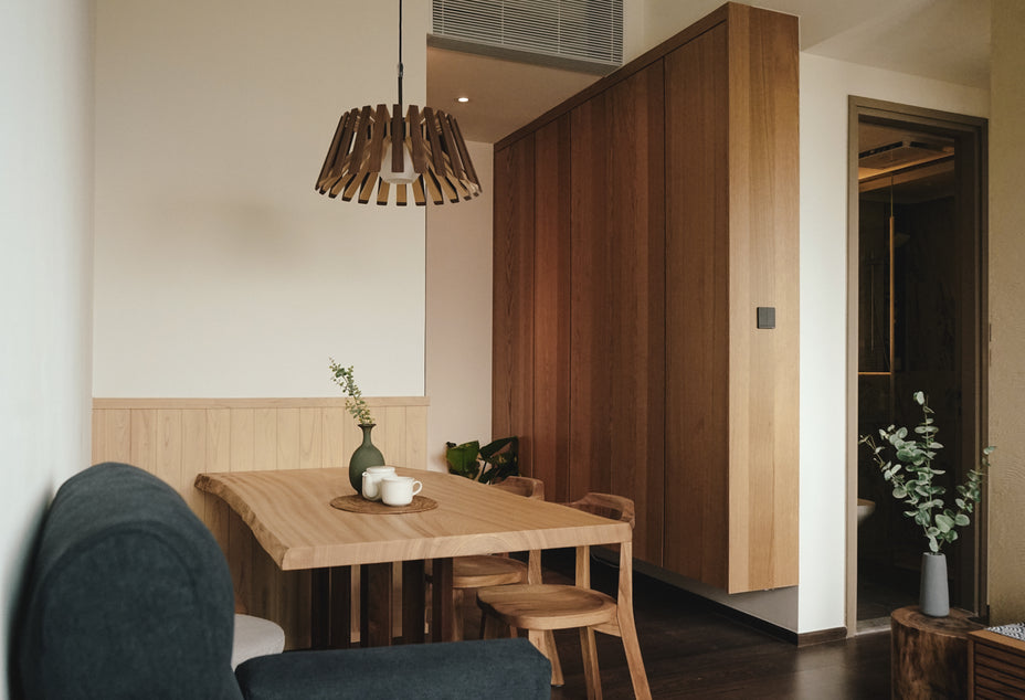 由於地板選用了胡桃木,所以客廳的家具選用了淺木色,例如日本家具品牌推出的SALA Sofa ,讓整體環境不會太昏暗。飯廳部分用了木框圍牆,和客廳的青海波紋牆相映成趣,更顯日系風格。