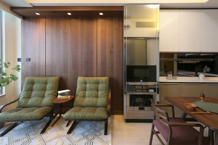 不少新樓宇採用統一的地板設計,每戶都一式一樣,但把全新的地板丟掉的話,又有點浪費。其實亦可以先選擇心儀家具,再配搭些簡單裝修,便可以為新家添上個人氣息!這次的單位位於匯璽,客人選擇沿用屋子本身的地板和間隔,在客廳的牆壁上安裝台灣訂造的胡桃木特色牆,前面再加上FUJI Furniture - Agio Chair和ASAHI - Side Table,簡潔得來又夠型格。