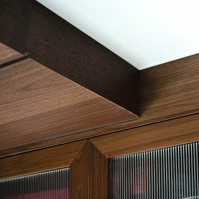客廳有多組高身儲物櫃,上半部特別做了玻璃門,除了可以減輕高身櫃的沈重感,更可以展示男戶主的滑浪戰績及模型收藏。同時,為了減輕木圍身的重量感,設計師特別以人字型方法來鋪地磚。