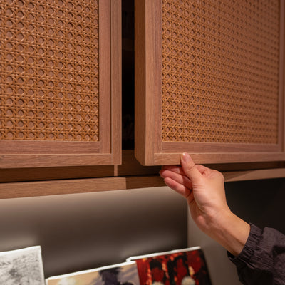 單位內亦用上了不同家居物料,像近年流行的藤網配木色鞋櫃,稻草漆的特色牆,粉紅色配搭白色細磚營造出舊有紅磚屋感等飯廳部份的日式風格,提供儲物空間之餘,亦增添整個家居的風格。浴室牆身以木紋地磚及白色細磚以上下分層所造成,配合日式浸缸及日式座廁營造出日式風呂感覺。