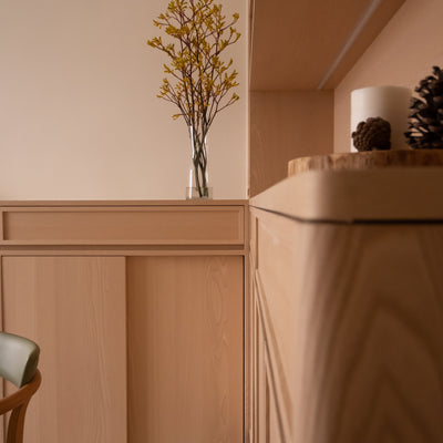 這個位於鴨脷洲的單位,面向香港仔避風港,有著大量自然光的優勢。設計師選用了淺木色和白色的牆身作為主要配搭,營造一個溫馨的氛圍,讓整個空間充滿活力,溫暖自然。主人房的空間相對較小,而且窗台剛好在轉角的位置,無法放置床。設計師改為趟門設計以節省空間,輕易設置雙人床之餘,同時最大化了衣櫃的使用空間,整體的實用性大大提升。