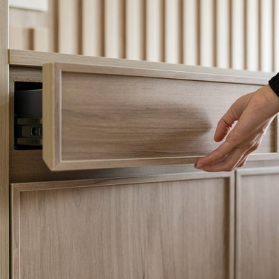 度身訂造的大型訂造櫃,除增加了儲物空間外,以橡木和暖灰色作主調。訂造櫃刻意保留與天花板之間的空間,與大門上的天花平衡地統一了高度,整體的空間更整潔。配上木系吊燈,和其他木系實木傢俬的設置,家居溫暖而舒適。為了增強居住空間的通透感和光線的穿透度,所有房門都使用了不同紋理的玻璃,巧妙地劃分了各個區域。 主人房的設計特別注重細節,使用了麻布質感的仿和式紙門。這種設計不僅為主人房增添了獨特的風格,還提供了一種柔和而溫暖的氛圍。同時,這種設計還節省了空間,使得主人房更加實用和舒適。