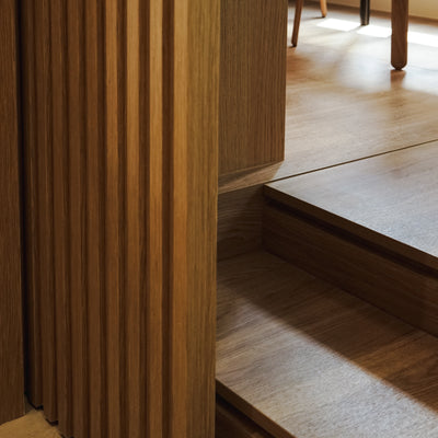 單位一踏入大門的左邊方向便是開放式廚房,將原來較窄的煮食空間延伸至飯廳,把廚房及飯廳融為一體,讓愛下廚的男主人有更大的平台施展廚藝。廚房採用了湖水綠色的暗花紋磚,為空間添加上更多的色彩。為了加強客飯廳的空間感,電視櫃位置的條子飾面牆延伸到主人房門,讓這個空間看上去更統一,條子牆上加些跳台給貓貓們休息,貓砂盤隱藏在浴室附近的櫃內,方便戶主為貓貓們清潔地方。