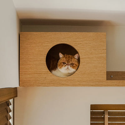 大量窗戶本是為舊樓設計的一大難題,設計師以木條子圍起,猶如把窗外風景裱起,和木百葉窗簾相映成趣,感覺也更日系,貓亦多了一個曬日光浴的空間。房屋不算太大,為了令主子們有充足的活動空間,設計師在牆上加上貓跳台,讓主子能在上方休息。房門以條子紋玻璃製成,早上時能有日光滲透,晚上又能分隔開貓和屋主的空間,加強私隱度。