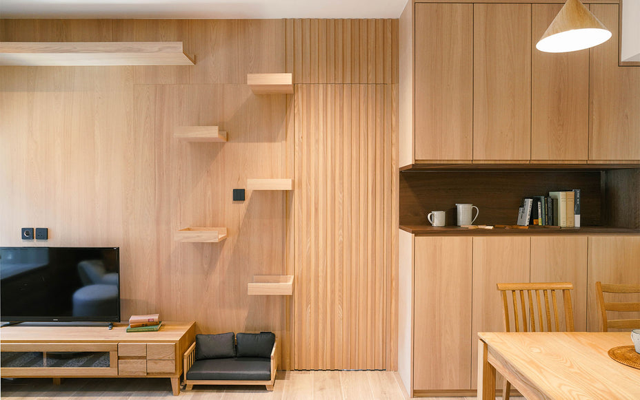 電視牆位置也為貓咪做了幾級跳台,讓貓貓住得更舒適。配上日本製的Vita TV Board,色調柔和,也和旁邊的條子隱藏門很合襯。